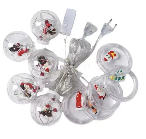 🎄 Esferas luminosas con figuras navideñas en miniatura como Papá Noel, muñecos de nieve y árboles de Navidad.